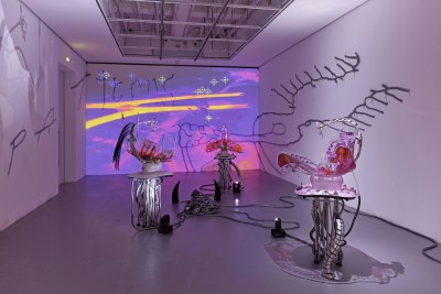 More specifically, Novitskova’s work focuses on the mapping of biological territories that are no longer outside but rather ‘inside’ biological bodies. The technological devices, such as microscopes or brain scans, used to mediate and depict those alternative geographies are able to merge datasets and biology, altering how biology and technology develop. In Novitskova’s mind ‘the look inside has somehow replaced the gaze into the future.’ From parasitic worms to robotic nurturing or incubating machines, technological devices are not only dominating the inner biological realm, but also the affective one. Novitskova’s adoption of the baby swings as readymades, turning them into sci-fi-like looking creatures, is a wink to new technologies of affection and care, mediated through algorithms and artificial intelligence. Those works bring up memories of the 'alien' depicted by science fiction, as well as the role of the non-human in a hypothetical not so distant future.